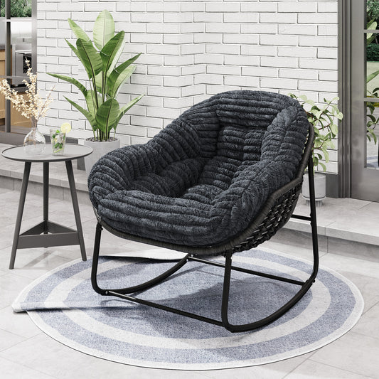 Black Iron Frame Rocking Chair with Bamboo Fabric & Teddy Velvet Seat Cushion – Luxe Oversized Papasan Chair for Indoor/Outdoor
