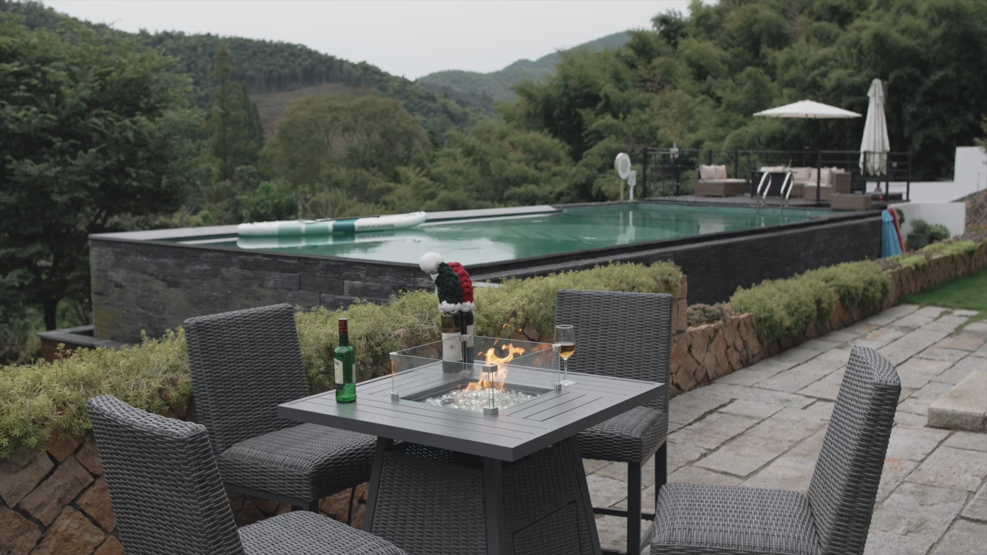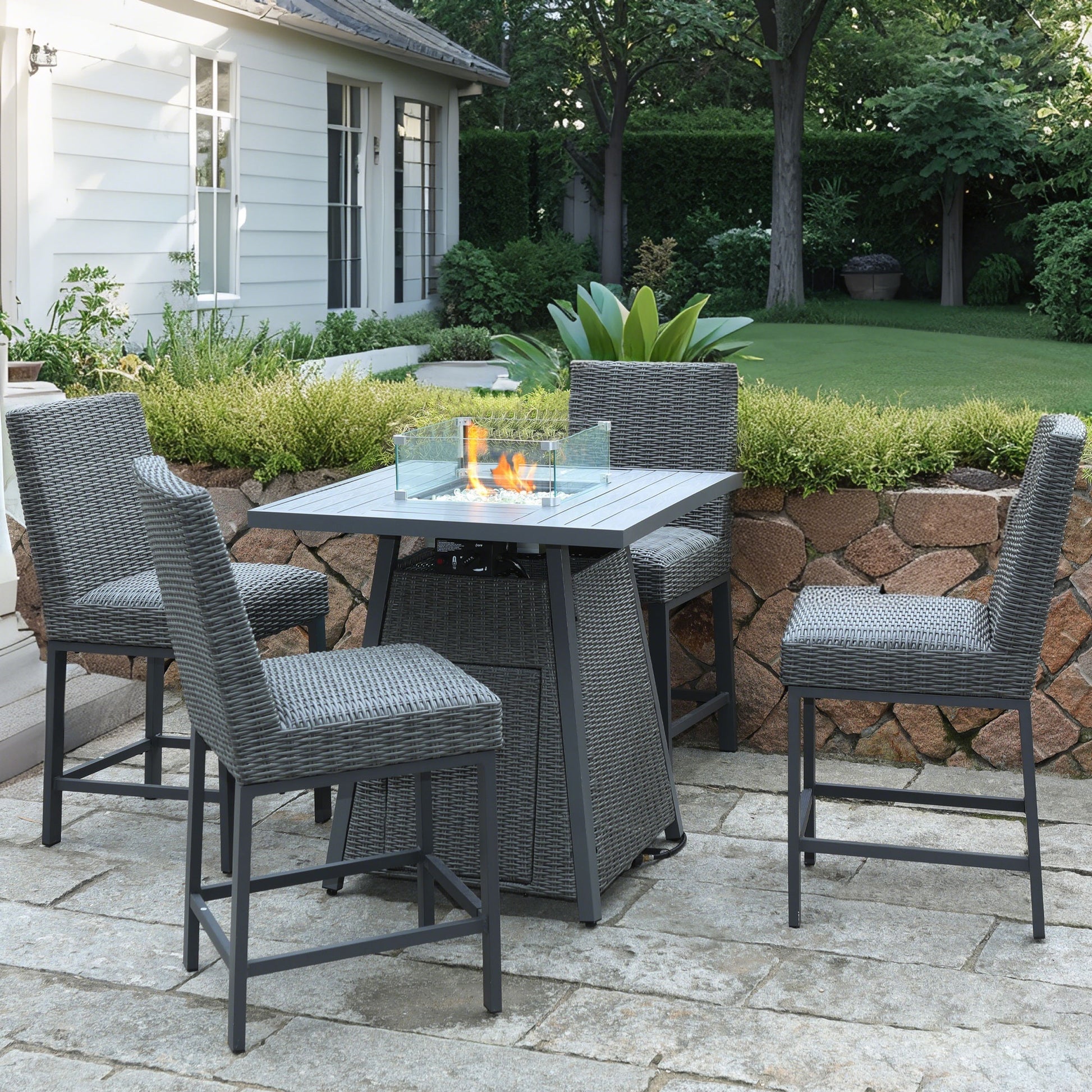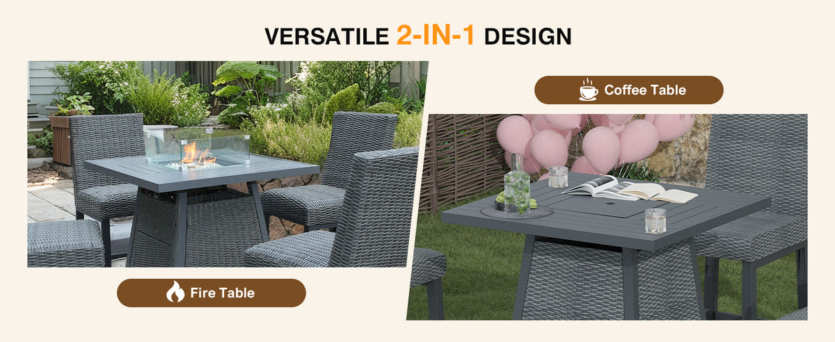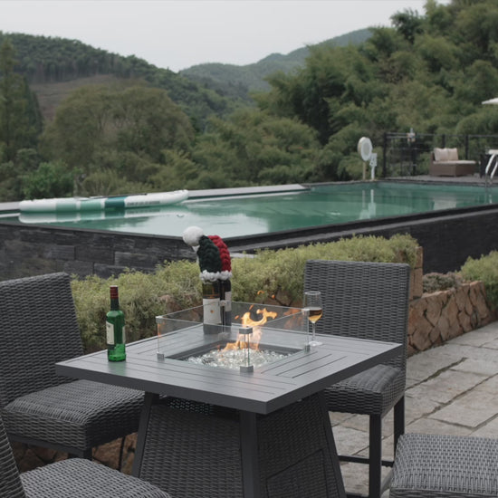 Stylish High-Top Fire Pit Table For Outdoor Spaces: Elevate your patio, deck, or backyard with our 36" high-top propane fire pit table, featuring a contemporary elevated design and a premium wicker rattan base. This square fire table for patio doubles as a bar-height table with its removable lid, blending elegance and functionality for entertaining guests or relaxing evenings outdoors