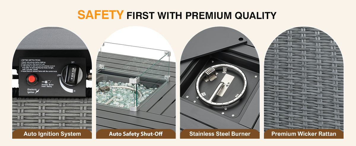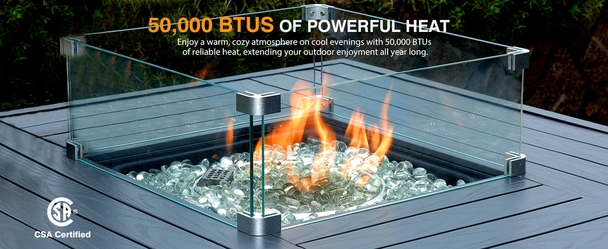 Powerful 50,000 BTU Heat With Safety Features: Stay cozy with a gas firepit for outside patio that delivers 50,000 BTUs of reliable heat. Equipped with an electronic auto-ignition system and emergency shutoff, this CSA-certified propane fire pit ensures safe, worry-free use all year round. Perfect for hosting friends or enjoying quiet nights under the stars