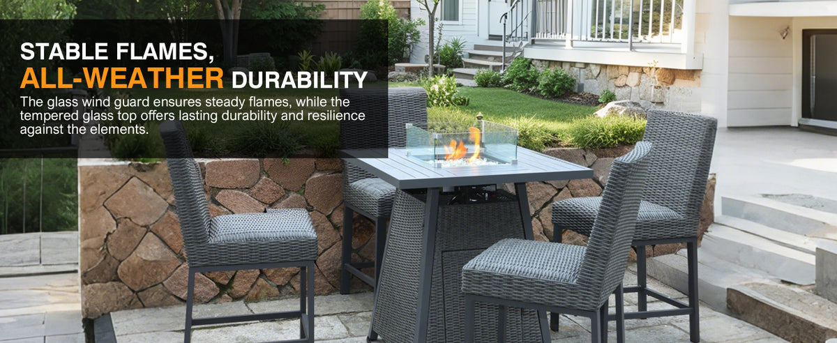 Easy Assembly & Perfect Fit: Designed for simple setup with all hardware and instructions included. Once assembled, this high-top fire pit propane table fits seamlessly into your outdoor space with dimensions 36.22"D x 36.22"W x 38.19"H and a 14.76" glass wind guard, creating a stylish and functional centerpiece for entertaining (note: no chairs)