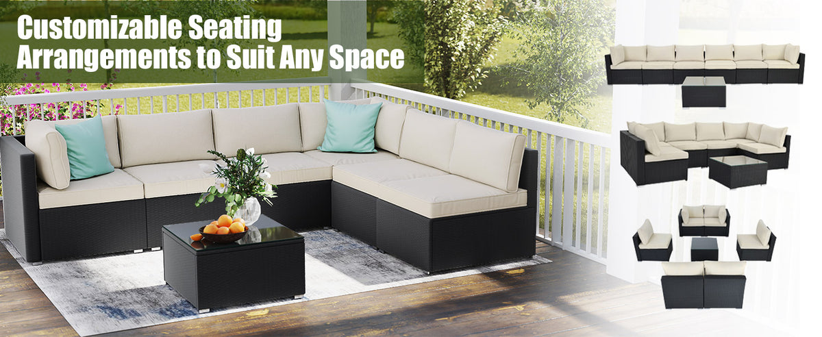Modular Design for Flexible Layouts: Customize your space with a versatile sectional design that can be arranged into U-shape, L-shape, or straight configurations. Connector clips securely lock pieces together for a seamless and stable outdoor furniture arrangement.