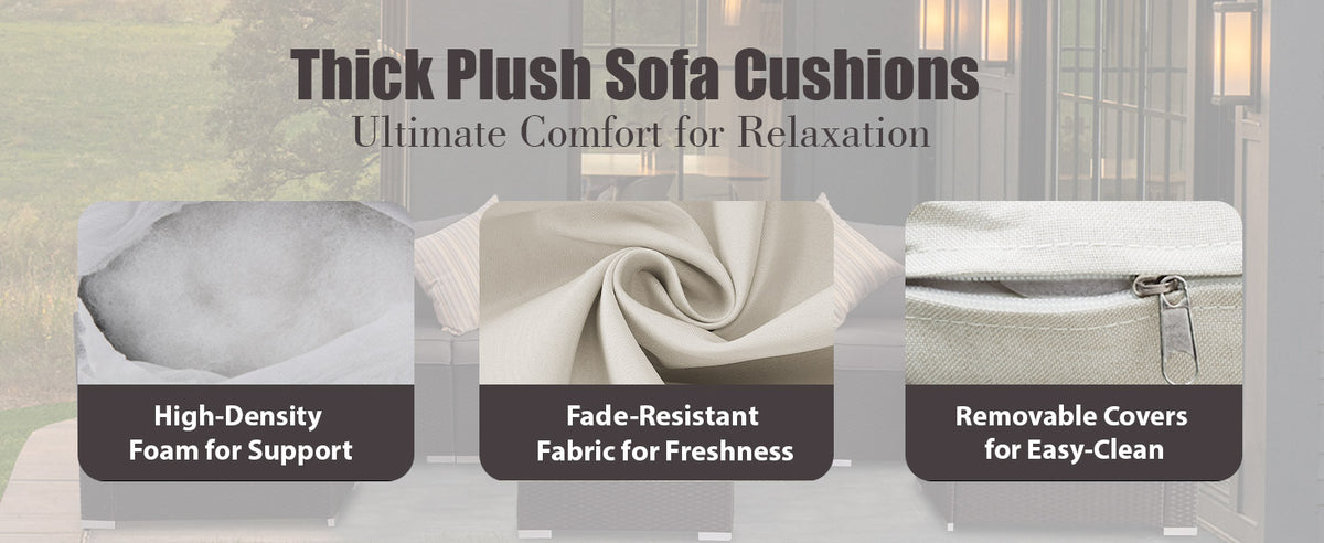 4″ Thick Water-Resistant Cushions: Relax into comfort with thick, plush cushions featuring removable and machine-washable covers. The water-resistant fabric makes cleanup simple, keeping your outdoor sofa set fresh and inviting season after season.