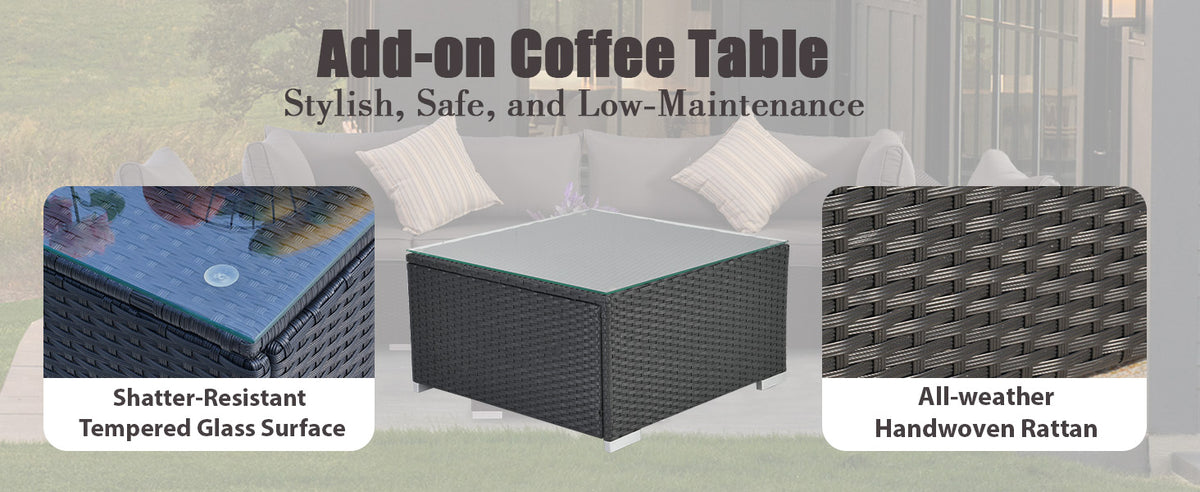 Included Wicker Coffee Table with Tempered Glass Top: Entertain with ease using the matching coffee table, featuring a durable tempered glass top that’s perfect for drinks, snacks, and decorative accents. A natural addition to any outdoor conversation set.