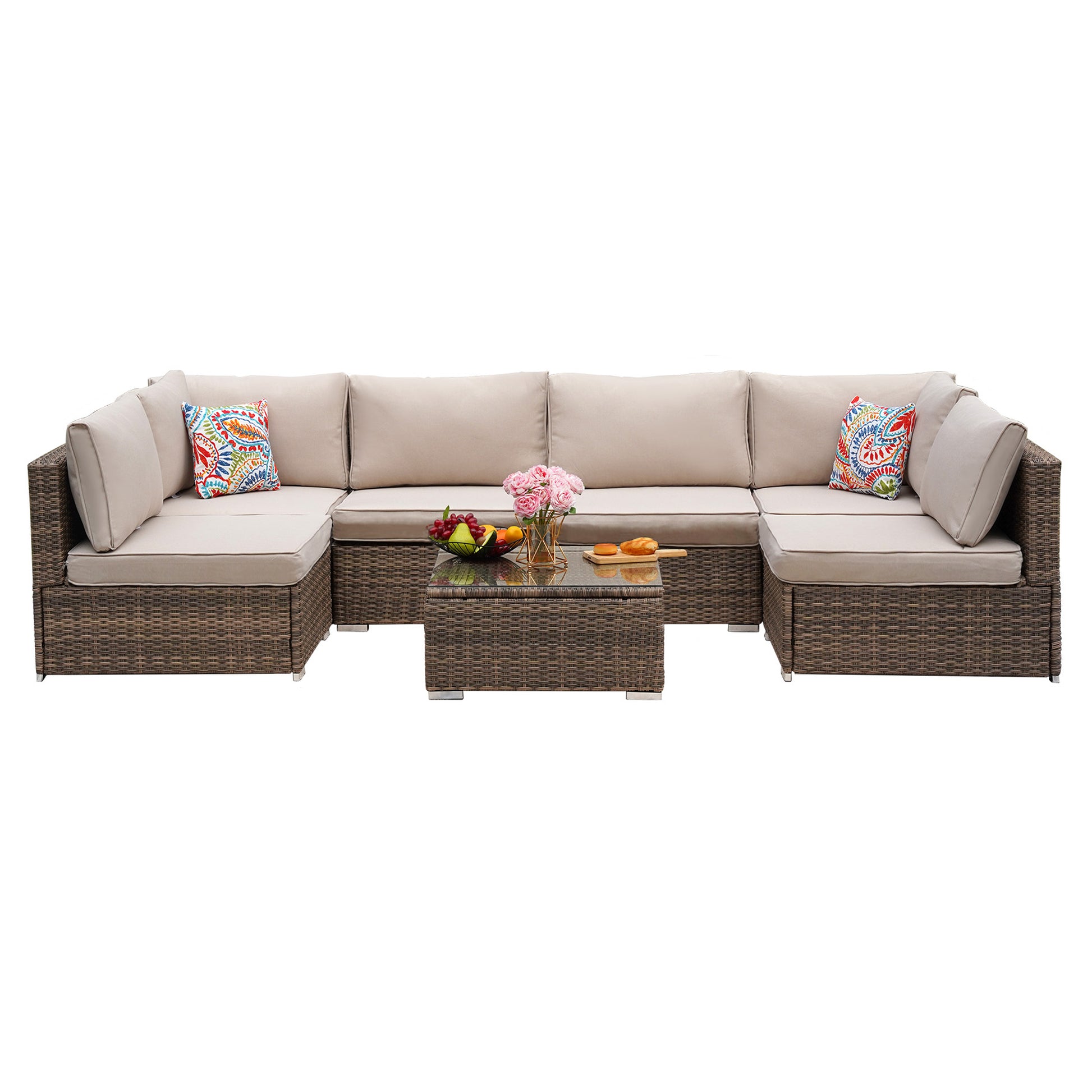 The 7 pieces rattan wicker patio sofa Furniture set is stylish, easy to maintain, perfect for Patio, Porch, Backyard, Balcony, Poolside, Garden, Lawn, Bistro, and other space. They are handwoven with PE Rattan Wicker around powder-coated strong steel frame. Water and UV resistant cushion covers are easily removable for cleaning, enabling it to withstand changeable weather. Solid steel frames provide superior construction, seamless finish and convenience.