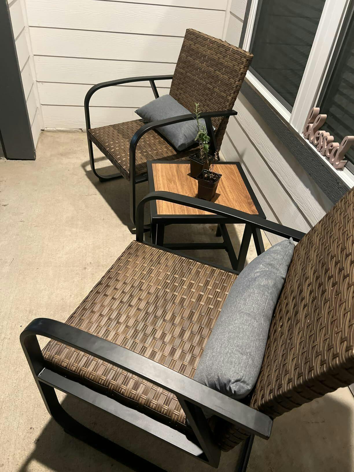 3-Piece Bistro Set For Any Outdoor Space: This stylish 3-piece bistro set, including 2 wicker rocking chairs and a matching DPC table, is perfect for enhancing outdoor scenarios like patios, balconies, gardens, backyards, and poolside areas. Bring a touch of elegance and relaxation to any outdoor setting